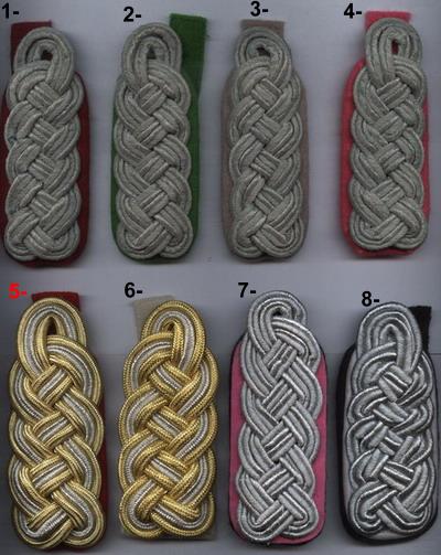German WW High Ranked Major to General shoulder Boards made in Aluminium wire in silver & Gold on different coloured backgrounds